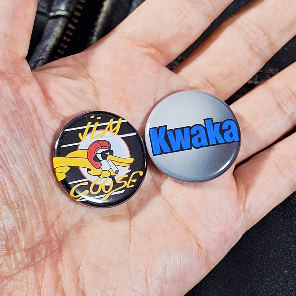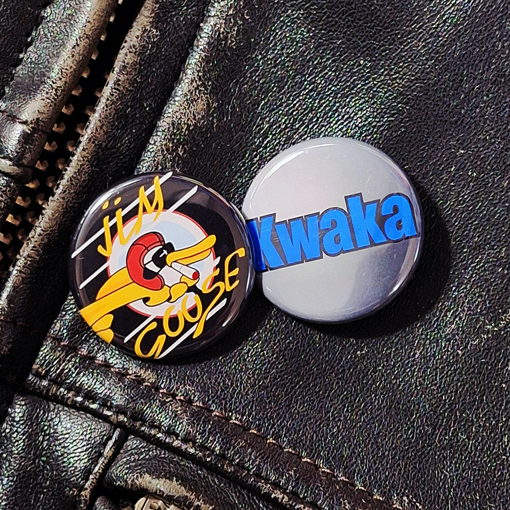 ジョージ・ミラー監督の映画「MADMAX(マッドマックス)」で主人公マックスの相棒グースの愛機z1000に貼られていたステッカーを缶バッジにしました。グースのキャラクターイラストとKwakaのセットになります。