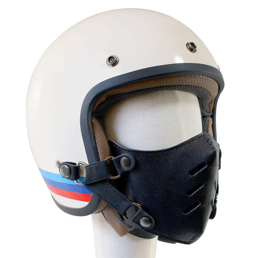 ライダーの顔を格好良く守る!防寒、虫、飛び石避け本革フェイスマスク RAVEN(6スリット) ジェットヘルメット取付 マスク装着が選べる
